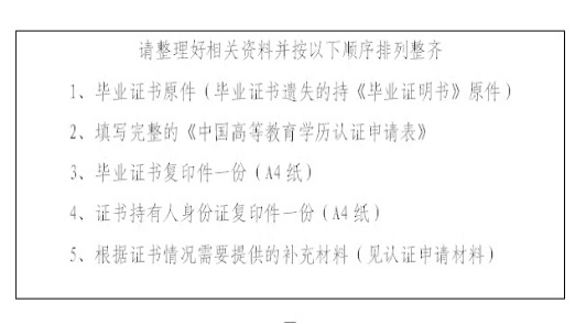 ① 写完整的《中国高等教育学历认证申请表》(点击下载)(http://www.hnbys.gov.cn/xlrz/xlrzsqb.doc),毕业证原件及复印件、身份证原件及复印件。
