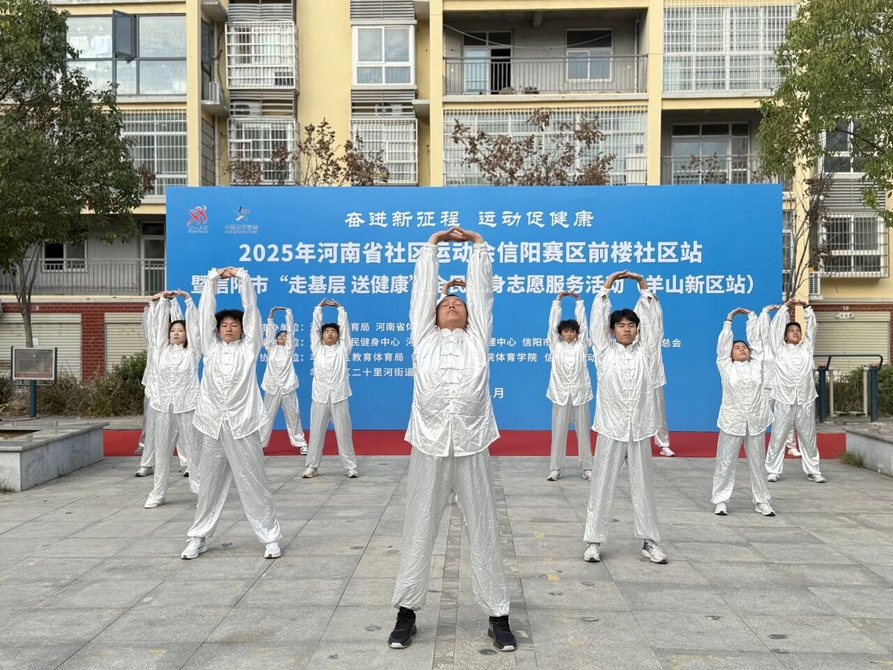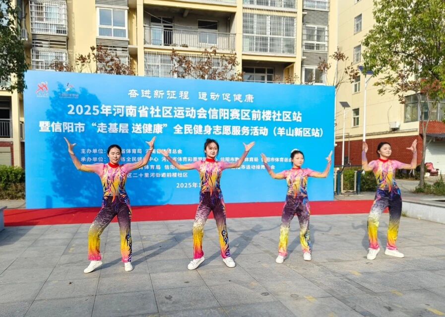 为深入推进全民健身国家战略与终身教育体系建设深度融合,让专业体育资源直达基层、服务群众,近日,2025年河南省社区运动会信阳赛区前楼社区站暨信阳市“走基层 送健康”全民健身志愿服务活动圆满举行。本次活动由河南省全民健身中心、信阳市教育体育局、信阳市体育总会承办,beat365英国官网网站体育学院充分发挥体育教育专业优势,将高校专业资源转化为社区惠民动能。同时,依托 “beat365英国官网网站二十里河街道终身教育教学点暨羊山新区社区学院” 平台,联合信阳市运动操舞协会、信阳市社会体育指导员协会、羊山新区二十里河街道前楼社区等多家单位共同协办。活动现场举行了庄重的启动仪式,一场以专业服务为核心、凝聚多方力量的文体盛宴就此拉开帷幕。