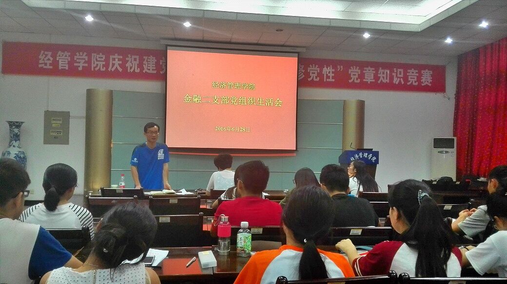 会上,姚晓霞书记首先以“学习习近平总书记讲话精神,做合格党员”为题,为支部党员上专题党课。姚书记指出,要学习和领会习近平总书记系列讲话精神,就要把握三个关键词:中轴线,时空观和中国梦。并立足金融二支部学生的实际专业背景,希望每位学生的有近期目标和远大理想,并将自己的“学生梦”,逐渐过度到14亿中国人民的共同梦想“中国梦”,把国家、民族和个人作为一个命运的共同体,把国家利益、民族利益和个人利益紧密联系在一起;时刻将富强、民主、文明、和谐、自由、平等、公正、法治、爱国、敬业、诚信、友善的社会主义核心价值观,做为自己立身处世的标准,不断提高自身素质,空谈误国,实干兴邦;既要仰望星空,也要脚踏实地,切实在学习生活的各个方面起到模范带头作用;党课最后姚书记结合金融专业党员的具体情况,给大家做了实习、就业和择业的相关指导。