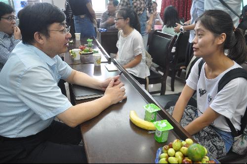 随后,研究生院招生处处长申让平对学校的研究生教育情况和资助政策支持做了详细介绍。他通过数据展示呈现出我校在研究生教育培养机制改革中所取得的种种成绩,强调在十二五期间我校将从加强推进国家化教育、完善奖助体系等举措来不断提高对研究生的培养水平。他倡导推免生应合理安排人生规划,结合自身情况进行客观分析,无悔选择适合自己的理想学府。