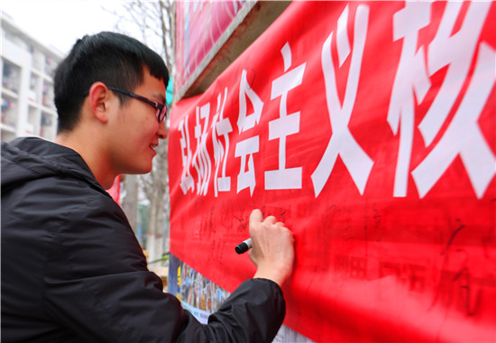 活动现场,两院工作人员在西雕挂上 “弘扬社会主义核心价值观,争做新时代五好青年”的横幅,并张贴符合社会主义核心价值观的图片,展现了学校的自然之美、人际之美、文化之美。图片展吸引了大量的同学前来观赏,工作人员通过耐心展示与精彩讲解,使社会主义核心价值观的理念深入人心,同学们也纷纷签名留念。工管五班张泽华同学说:“这次活动我收获颇丰,进一步理解了习近平总书记的重要讲话精神,并体验到了学校各个方面不一样的美,希望今后我们能够将社会主义核心价值观铭记于心,并拥有善于发现美的眼睛。”