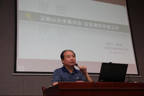 会上,教务处处长陈玉林从指导思想、审核评估的框架、指标体系内涵、教师教学档案和专家进校考察的环节等五个方面进行了生动的解读。他重点强调审核评估的五个度,即学校人才培养目标与培养效果的达成度、办学定位与社会需求的适应度、教学过程和教学资源与培养目标的保障度、人才培养过程与教学质量保障体系的有效度和社会用人单位对学生的满意度。同时以教师上好每一堂课为例,鼓励教师要真正的投入到教学中,才能提高本科生教育教学质量。