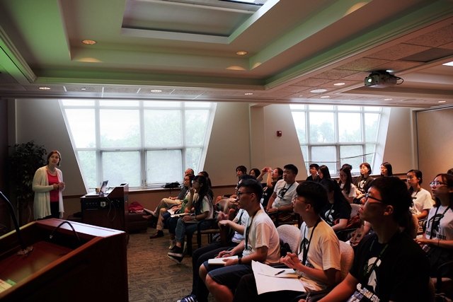 上午,访学团队来到国际教学中心,聆听了国际学生办公室副主任Brooke Stokdyk女士以及留学教育办公室Cheryl Benner女士的报告。Brooke就留学准备、留学生活、留学生因文化差异而面临的挑战和应对方式等进行了讲解,鼓励留学生要多走出本国同学的小圈子,与其他国家学生交流。Cheryl为大家讲解了MSU的招生政策、留学服务以及MSU的独特文化,并在轻松的气氛下带领访学团成员高喊MSU在Big Ten(美国名校十大联盟)橄榄球联赛中的口号“Go Green!!Go White!!”。访学团队成员反响热烈,并对报告中的细节以及感兴趣的假期生活、学生社团、志愿者项目、校内工作等提出疑问,得到了耐心解答。