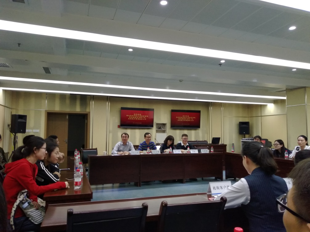 下午3点,师生们一行来到了中国建设银行宝鸡市分行,作为西农校友的王力副行长热情接待了师生一行人,随后的座谈会气氛活跃,师生们积极向建行宝鸡市分行工作人员提问有关招聘、晋升机制、福利待遇以及一些金融实务方面的问题,王力学长以及现场的工作人员详细耐心的解答同学们的各种疑惑,会上不时传来热烈的掌声。