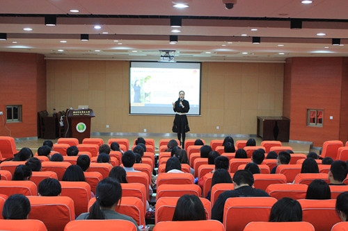 本次会议分为礼、尚、网、来、沟通五项内容。会议伊始,张梦楚提出五个 “我是什么”的问题,她强调:“人生要先活出宽度,在活出深度和长度。并且在与考官的互动过程中一定要扬长避短,体现个人价值并且要注重团队精神。”随后,张梦楚与学生进行友好互动,让每位同学在纸上画出与自己最相符的动物形象,并与周围同学分享,以此锻炼交流沟通的能力。她指出:“仪表、仪态、仪容都是应聘的关键所在。面试不能生搬硬套,而应与实际相结合,要学会灵活应变各种突发情况,才能赢得用人单位的青睐。”接着,她亲切地与同学们交流优雅的自我介绍礼仪公式,并要求与会男生和女生分别起立,练习站姿和迎宾体态。张梦楚以身作则、认真指导,同学们受益匪浅。