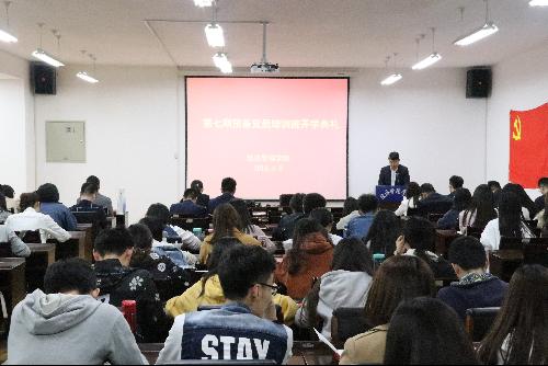 4月9日晚,350vip浦京集团官网在C401会议室举办第七期预备党员培训班开学典礼,党委副书记温晓林出席并讲话,学工秘书张静、党课班主任梁润雅、吴春生、各学生党支部书记及第七期预备党员培训班全体学员到场参加,会议由马奕颜主持。