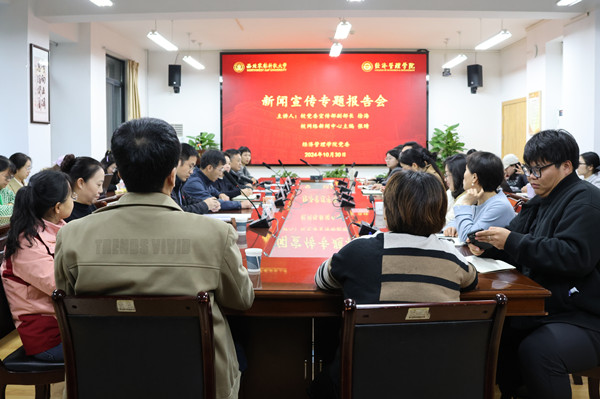 10月30日,学院举办新闻宣传工作专题报告会,校党委宣传部副部长徐海、校网络新闻主编张晴受邀主讲。学院党委书记石颖贤、院党委副书记张军驰、副院长王军智及师生代表50余人参会。