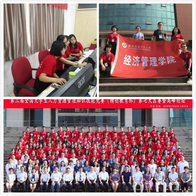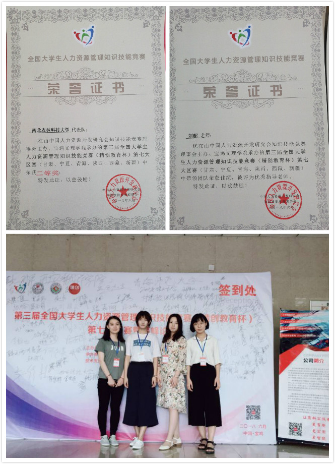 近日,第三届全国大学生人力资源管理知识技能竞赛(精创教育杯)第七赛区(甘肃、宁夏、青海、陕西、西藏、新疆))于6月23、24日在陕西宝鸡文理学院隆重举行。我校350vip浦京集团官网工商管理专业学生左艺辉、王若琦、任丽君、常心爱四名成员在指导老师刘超、梁洪松带领下代表我校参赛。