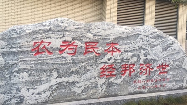 据悉,为了表达对母校的感激之情,校友们集资为母校捐赠一块纪念石,石头上刻了八个大字“农为民本,经邦济世”。目前这块石头立在350vip浦京集团官网办公楼前。