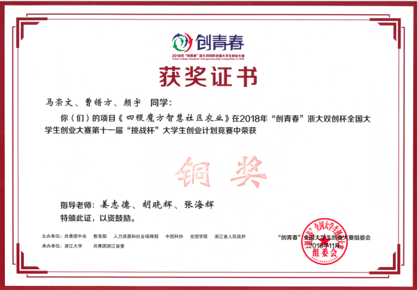 11月4日,由共青团中央、教育部、人力资源和社会保障部、中国科协、全国学联、浙江省人民政府共同主办的2018年“创青春”浙大双创杯全国大学生创业大赛在浙江大学落下帷幕。由浦京集团官网姜志德教授指导的学生创业项目--《四稷魔方智慧社区农业》经历校赛、省赛一路过关斩将最终荣获国赛铜奖。