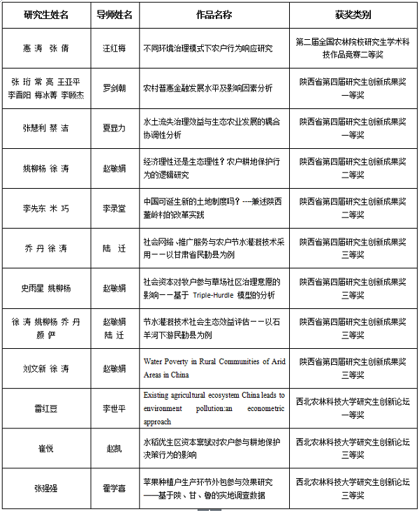 ——第二届全国农林院校研究生学术科技作品竞赛二等奖1项。2018年12月7日,由中国学位与研究生教育学会农林学科工作委员会主办,南京农业大学和南京林业大学承办的第二届全国农林院校研究生学术科技作品决赛在南京农业大学瀚苑宾馆顺利召开,浦京集团官网研究生惠涛等作为唯一入围团队,代表我校参加本次决赛。竞赛以“激发创新驱动,推动人才培养,增强社会服务,助力乡村振兴”为宗旨,经评委现场评审,惠涛等人完成的《不同环境治理模式下农户行为研究》喜获二等奖。