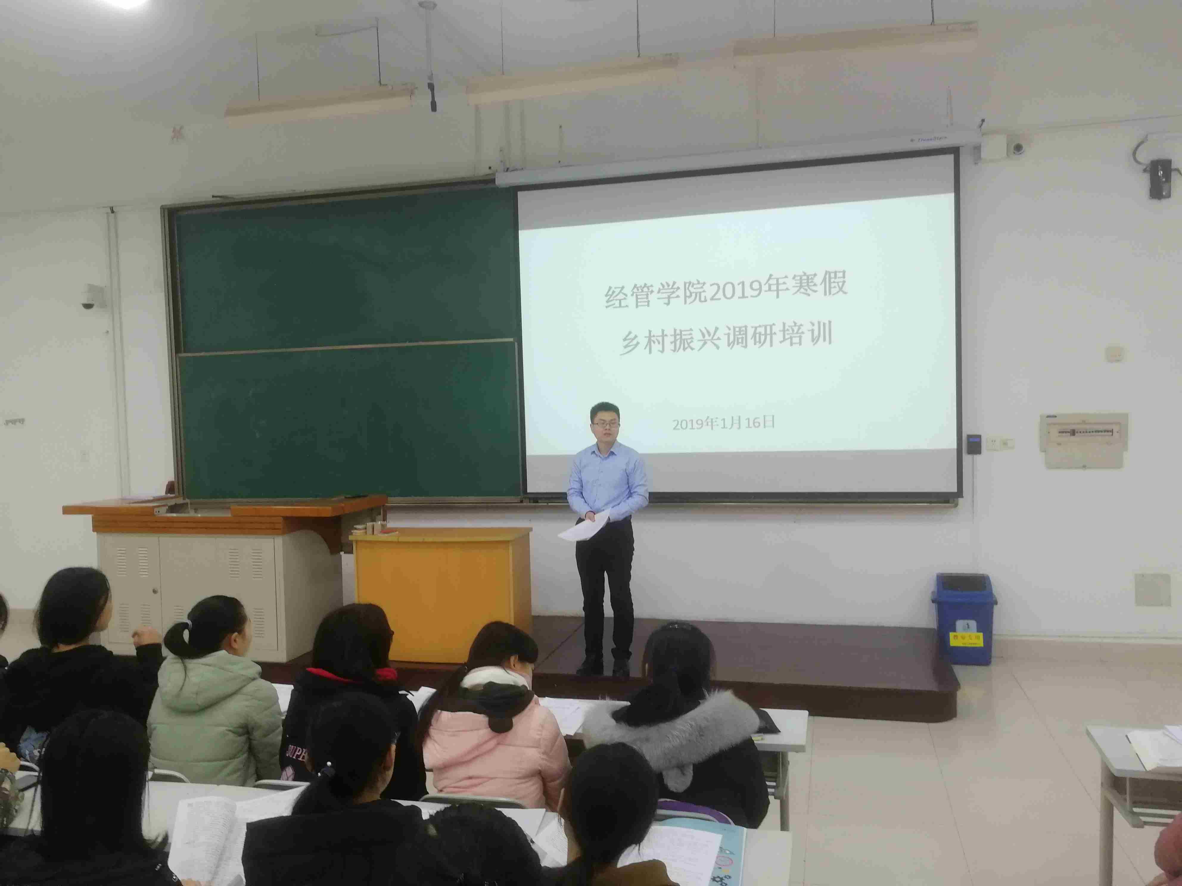 2019年1月16日下午,学院青年教师张蚌蚌为100余名大学生进行了调研培训,本次培训内容包括村级问卷和户级问卷两个层次,问卷内容涉及乡村振兴的“产业兴旺、生态宜居、乡风文明、治理有效、生活富裕”二十字方针的方方面面。同时,对调研报告撰写、“三农问题”分析方法、农村土地制度等农村现实问题进行了讲解与培训。