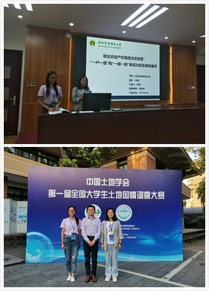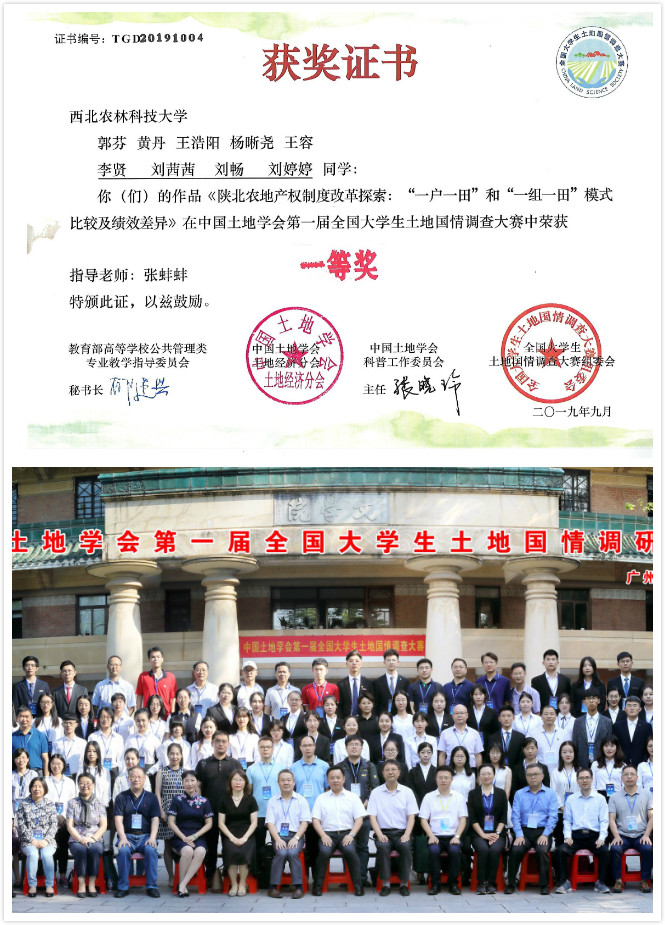 浦京集团官网土地资源管理专业2017级本科生郭芬、黄丹等领衔的行者团队在浦京集团官网青年教师张蚌蚌博士指导下,以“陕北农地产权制度改革探索:“一户一田”和“一组一田”模式比较及绩效差异”参赛作品入围决赛并荣获一等奖(奖金5000元)。该奖项的获得,有效锻炼了本科生的探索和研究能力,显著促进本科生加强专业课程学习并学以致用。队长郭芬感言,从确定题目、到问卷设计、到报告撰写,一次次的修改和制作PPT,多次的演练,成绩的取的离不开指导教师和陈海滨老师的悉心指导,感谢学院提供的平台。指导老师张蚌蚌说,“能够与东道主华南理工大学代表队,南京大学和浙江大学代表队共同获得一等奖,提升了我校在同行中的声誉;体现了本科生的卓越创新能力,培养了学生的爱国和恋土情怀,激发了学生探索认知祖国土地的激情”。
