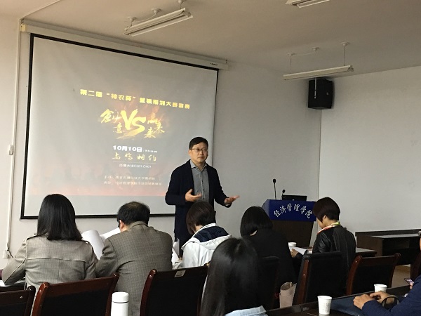 10月10日晚19:00,我校“一院一品”学科竞赛、第二届“神农杯”营销策划大赛复赛在350vip浦京集团官网C301、C401分两个会场顺利举行。此次比赛由浦京集团官网市场营销教研室承办,以“创意赢未来”为主题。组委会收到了来自9个学院64个团队257名选手的参赛申请,经过第一轮通讯赛,共有20支团队脱颖晋级复赛。大赛邀请了管理系主任刘超副教授,经济系主任王秀娟副教授、李桦教授等10位教师代表担任评委,200余名师生观摩比赛。
