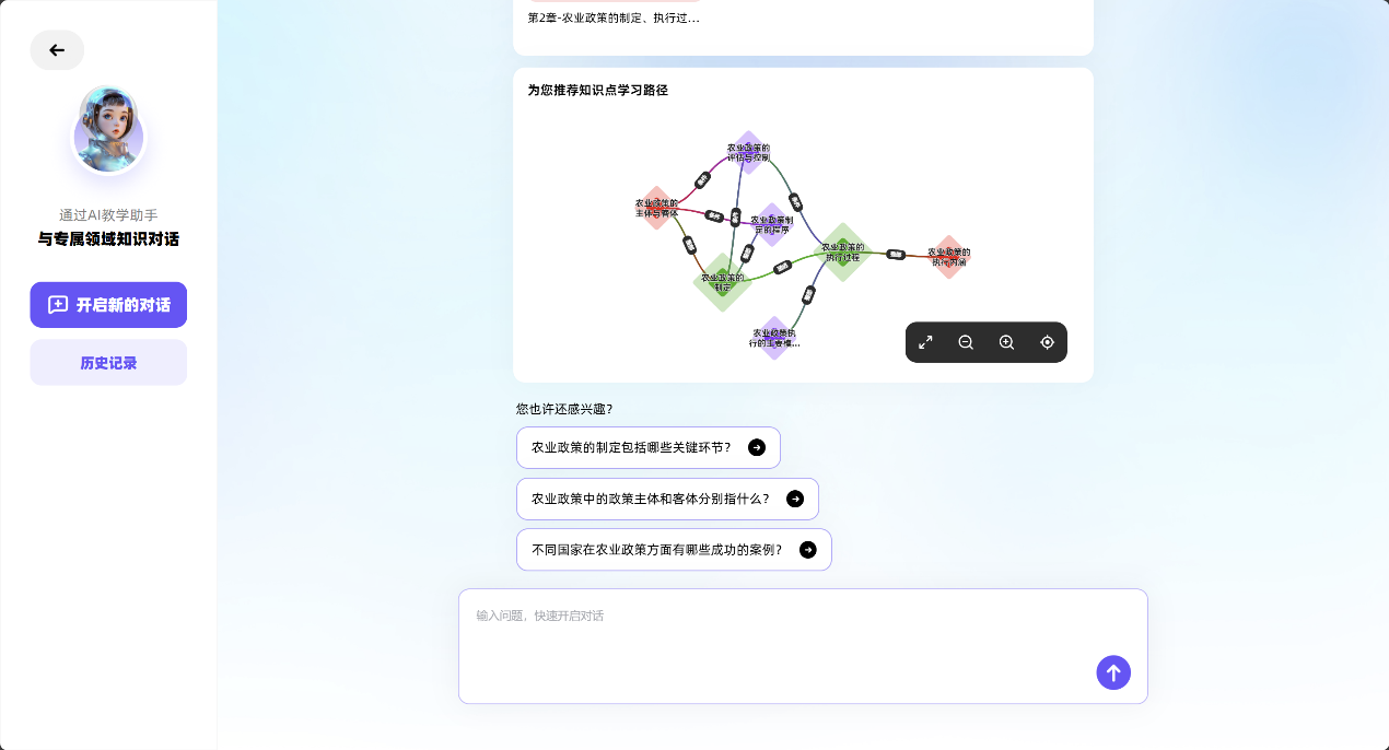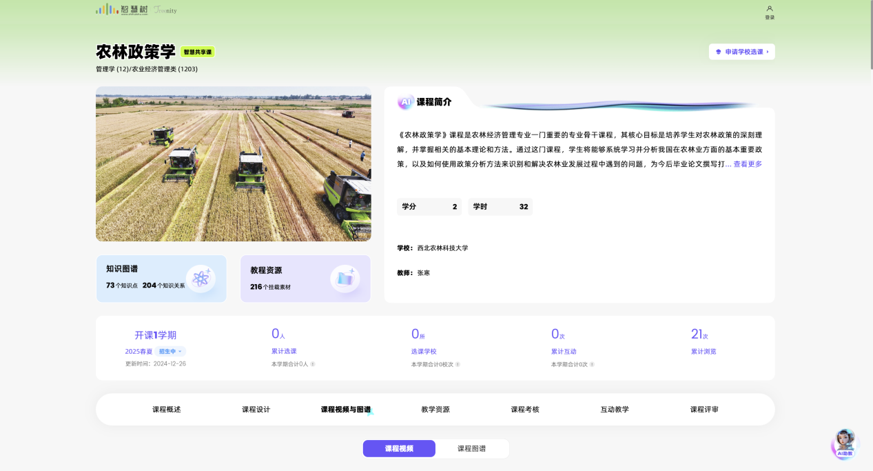 为深入贯彻落实党的二十届三中全会和全国教育大会推进教育数字化有关战略部署,推动人工智能赋能人才培养创新,以课程改革小切口带动解决人才培养模式大问题,实现高等教育改革创新发展强突破,《农林政策学》AI课程将数智化技术与教育教学相结合,更高质量开发汇聚教育教学数字资源,从人才培养方案出发,面对多学科交叉融合的特点,把最前沿的信息技术及其他相关技术融合到课程中,形成基于“能力图谱-问题图谱-知识体系-资源资源”的结构化课程体系,应用于教、学、管、考、评的全流程中,覆盖了农林政策学习的全周期,满足老师提质提效的“教”、学生个性化无边界的“学”。