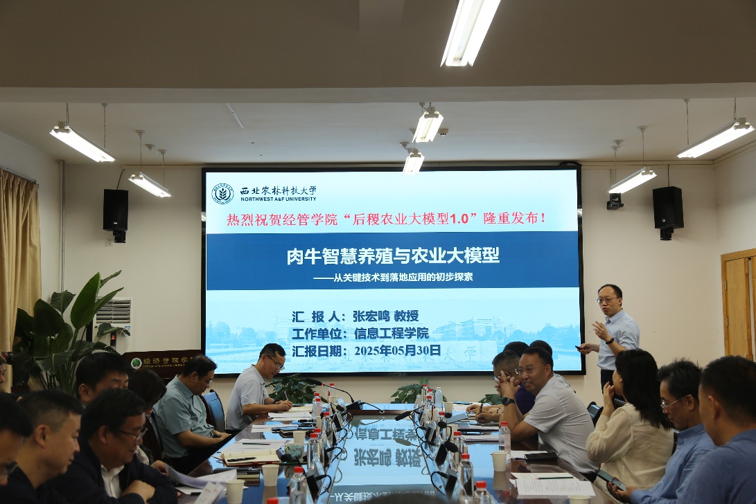 产学研研讨环节,学校植物保护学院院长郭军教授,国家苹果产业技术体系首席科学家、园艺学院张东教授,信息工程学院院长张宏鸣教授分别汇报了“后稷·御锈”(小麦条锈病)、“后稷·优果”(苹果种植)、“后稷·智牧”(肉牛养殖)三个大模型子应用的相关情况。
