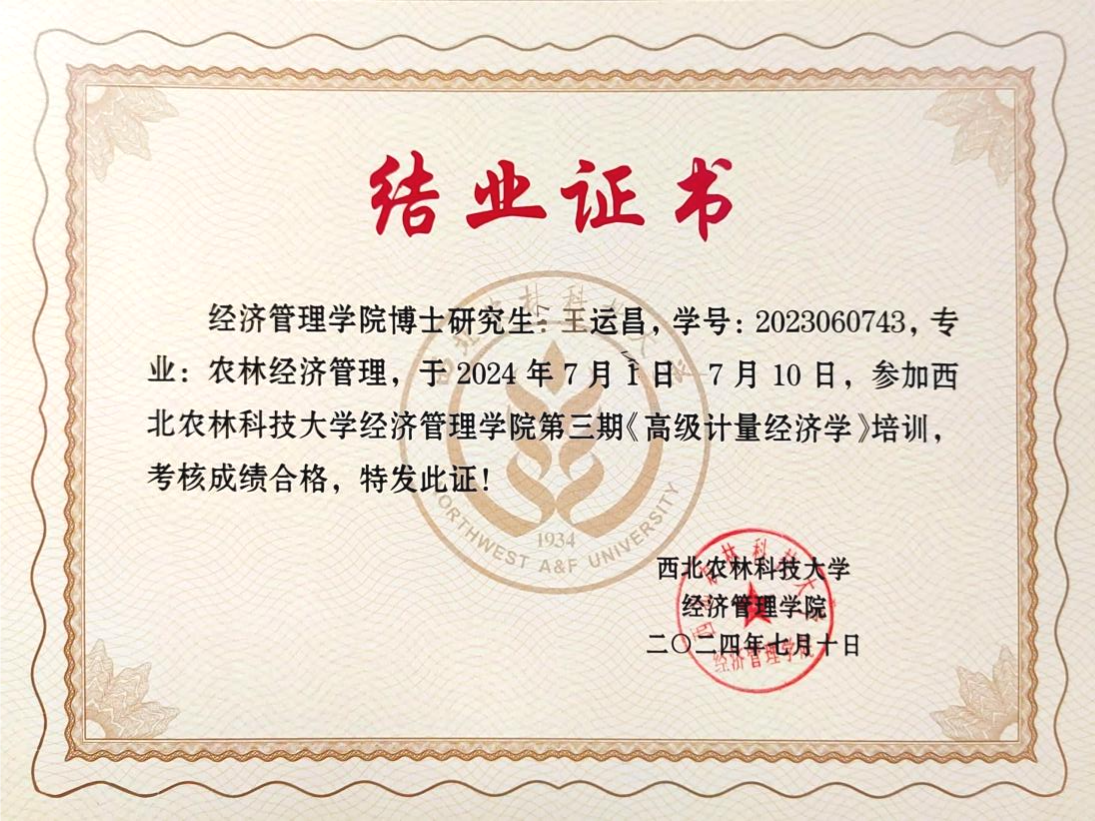 7月1日-10日,为夯实研究生高级计量经济学理论基础,提升应用计量经济学方法从事经济研究的能力,350vip浦京集团官网邀请郑志浩讲座教授、美国SAS研究所首席计量经济学家孙传忠博士、中国农业大学350vip浦京集团官网陈祁晖教授以专题形式讲授高级计量经济学知识,开展了一场为期10天32学时的高级计量经济学培训。团队博士研究生王运昌,硕士研究生沈霜、田思宇、杨婕妤全程参加了本次培训。