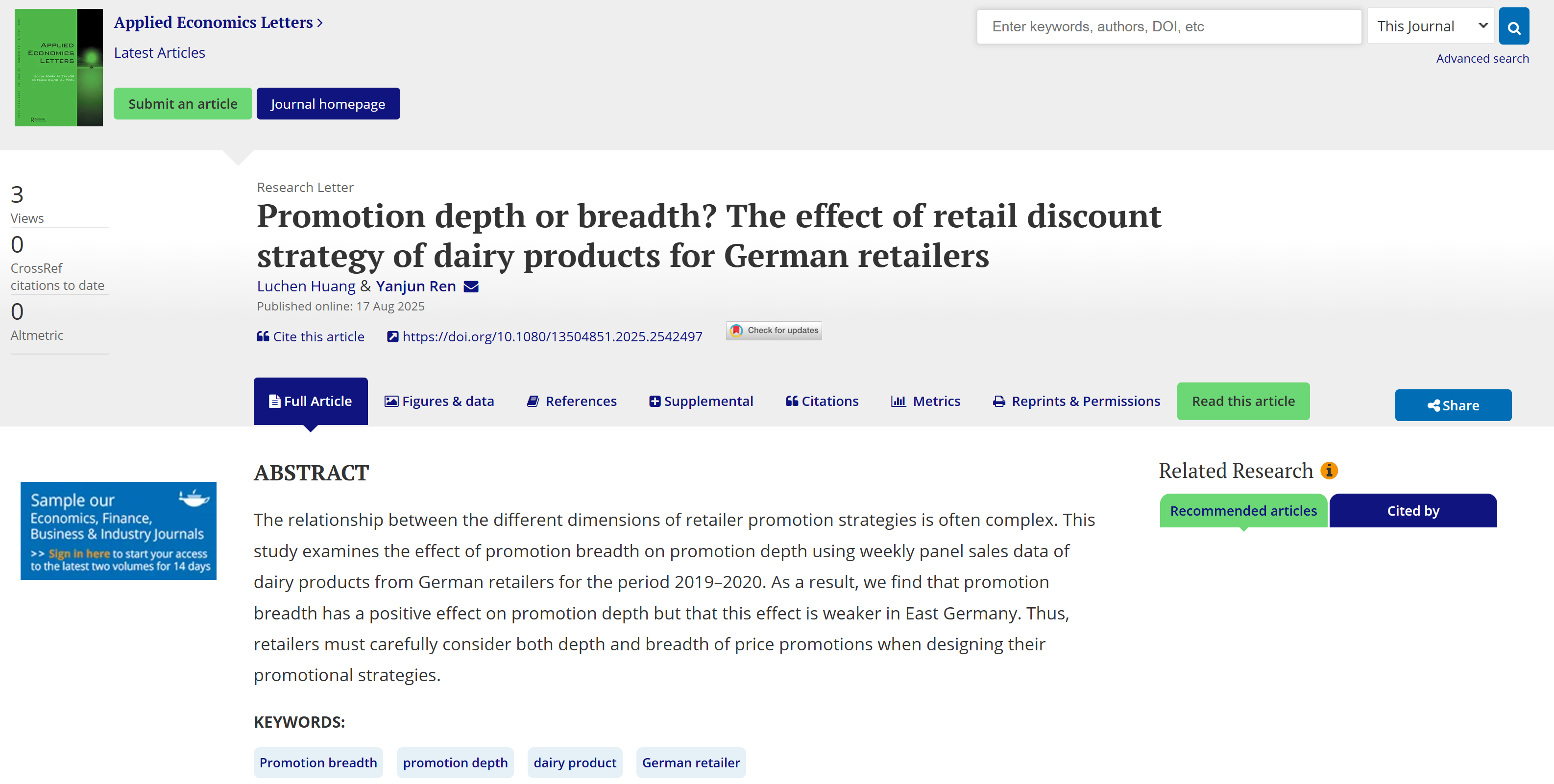 近期,350vip浦京集团官网350vip浦京集团官网任彦军教授课题组在《Applied Economics Letters》发表最新研究成果,论文题目为“Promotion depth or breadth? The effect of retail discount strategy of dairy products for German retailer”。任彦军教授为论文通讯作者,黄禄臣博士生为论文第一作者。
