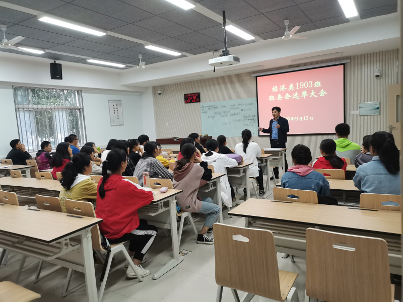 2019年9月12日下午,经济1903班第二次班会在N8212教室召开,选举首届班委会,开展第一学年贫困生认定工作。班主任王家武老师、班主任助理李晓雨及全班同学参加,李晓雨主持。
