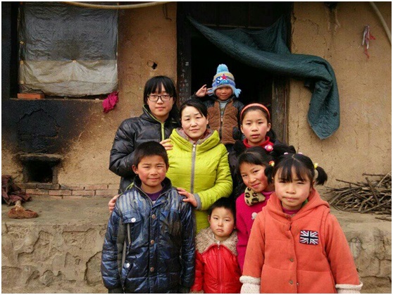 队员杨凡与被调查者(留守妇女)和她的三个孩子、同村两个孩子合影
