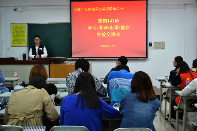 为发挥优秀学子的先锋模范带头作用,引导低年级同学做好学业和职业生涯规划,4月15日晚,金融二支部在北校8120教室举行党员走基层活动之学习、考研、出国、就业经验交流会。张文静、王东升等7位优秀学生代表受邀担任主讲嘉宾,支部书记暨营销141班主任石宝峰主持会议,支部13级学生及营销141班全体成员到场聆听。