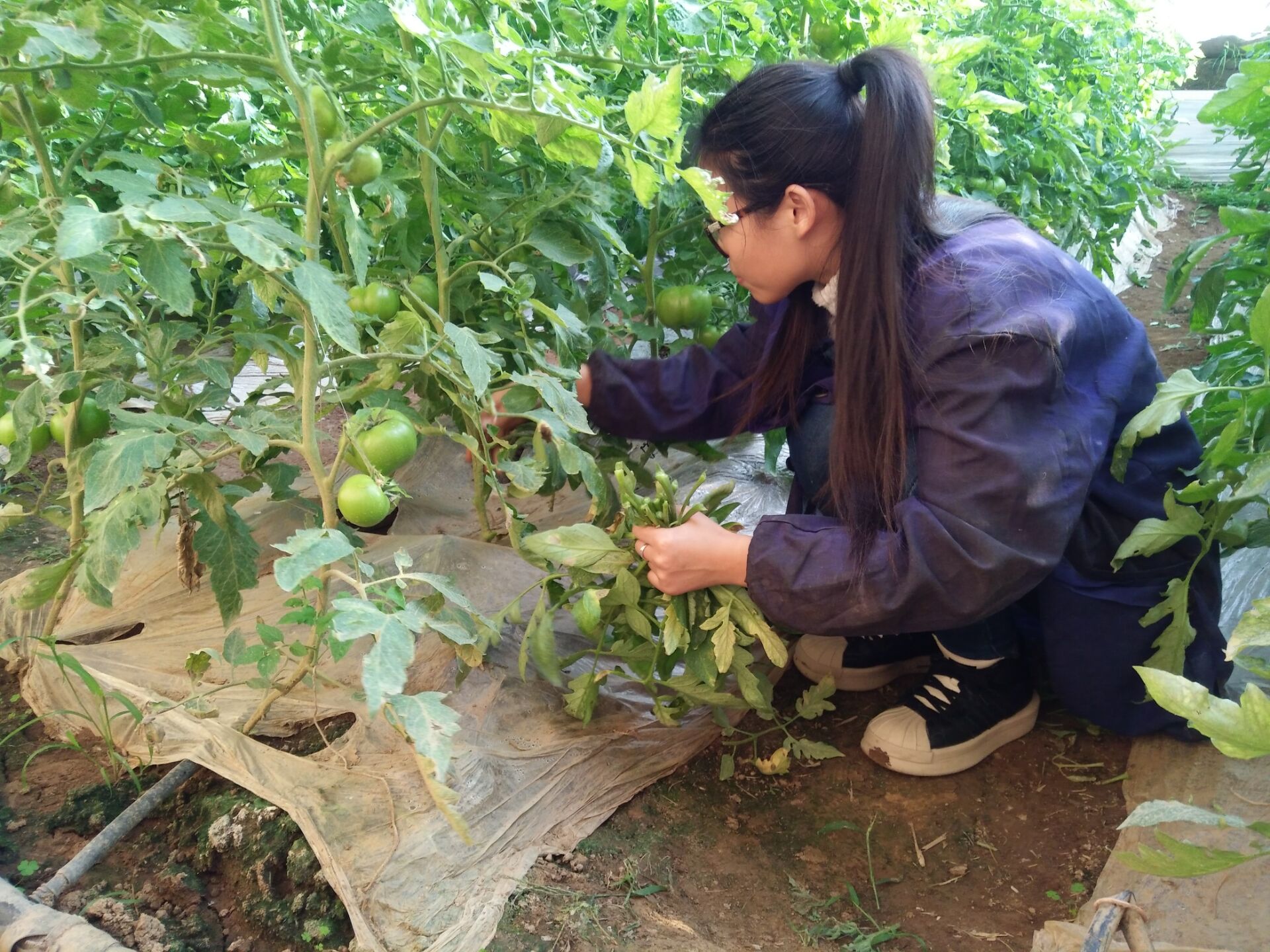 两个多小时的时间不知不觉就从指间溜走,队员们除枝速度从慢至快,动作愈发娴熟,汗水也浸湿了衣物,然而这却挡不住志愿者们劳动的热情。在这个过程中,志愿者们学习到了西红柿的除枝技巧。最后,队员们协力把修剪后的枝叶清理出去,以免产生病菌。