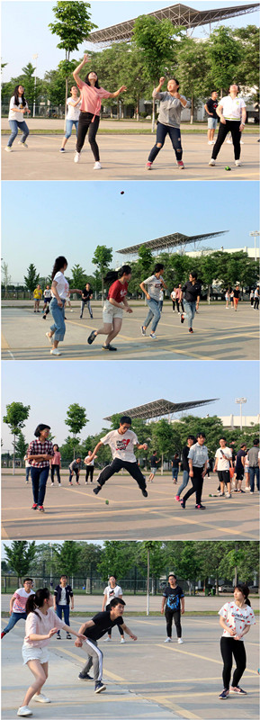 在主持人简单介绍游戏规则后,比赛正式开始。5月的烈阳挡不住青春的热情。赛场上,投掷者使尽浑身解数,声东击西、讲战术、打配合;闪避者东闪西躲、讲策略、比身手。短暂的10分钟战斗,笑声不断,啦啦队欢呼呐喊加油助威,掌声经久不息。比赛结束后,赛场进入大混战,辅导员老师们也加入激烈的沙包游戏中。