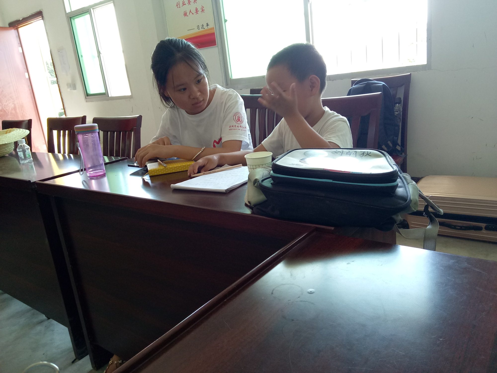 该日上午,队员们主要针对儿童们的暑期作业,对其疑难点进行讲解。来学习的儿童大部分为小学生,队员们发现,部分学生的算术能力较差,其中口算能力是大部分人的弱项,于是队员们针对个别学生,对其进行口算专项训练。其中一个队员说到:“就拿约分来说,对我们来说就是简单的分子分母同除以相同的数,但小学生总要问个为什么,这时候,我们就需要站在他们的角度上,用简明的方法讲透其中道理。”