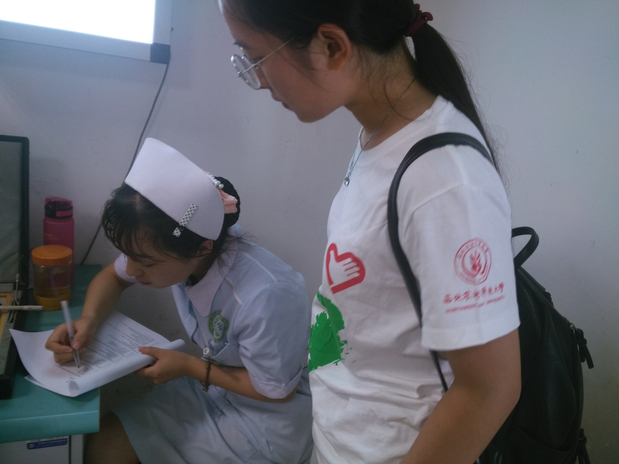 7月25日一大早调研队5人就到达目的地,武功县人民医院出乎意料地人满为患,到处穿梭着医生护士的身影。调研人员先是进入办公大楼,对后勤部门财务部和库存部进行了调查问卷的发放收集和相关问题的提问,随后来到住院部,采访了骨科和外科一部的护士,最后来到门诊部,对内科主任和胃镜科主任进行了访问。临近中午,42摄氏度的高温,热浪一波接着一波,超负荷的工作连着疲惫的心身,医护人员想着的还是患者的需要,穿着干净的白大褂,始终坚持在岗位上。“无论何时,只要穿上这身白大褂,再苦再累也得对得起患者”一位财务部的负责工作人这样说道。