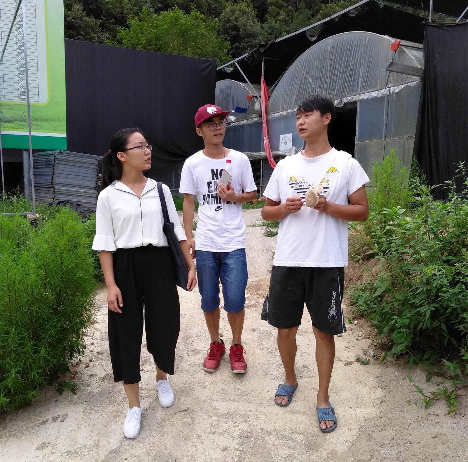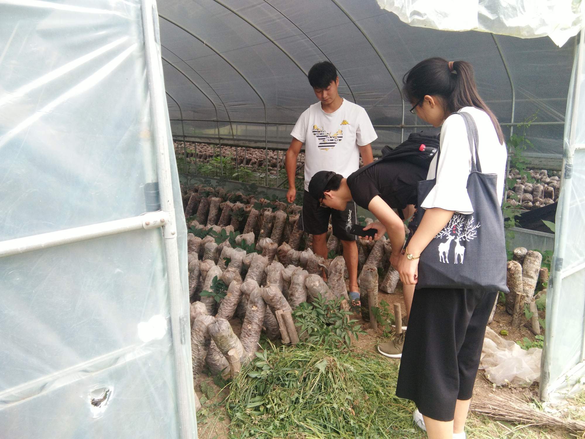 首先到达了宏鑫食用菌专业合作社,队员们受到了黄总的热情接待,他亲自带领调研队员们进入大棚参观香菇的生长状况,并认真回答队员们提出的问题,为本次调研提供了十分重要的数据信息。