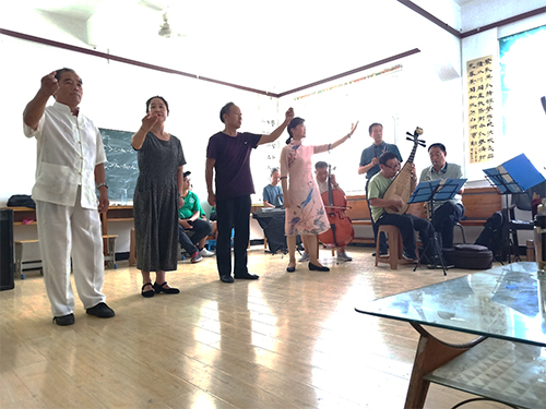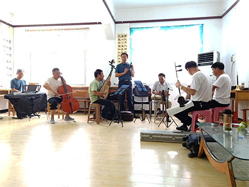 队员们来到文化馆感受到的是馆内人员的专业与全身心的投入。司鼓演奏者两声清脆的鼓声之后,板胡、唢呐、提琴、琵琶一齐奏响,梆子、电子琴、笙也逐渐奏响。演奏者随音乐节奏自然地晃动身体,表情时而微笑、时而严肃,沉浸于演奏中。陆陆续续有演唱者进入房间,轮流上阵演唱。从他们的对话中队员们得知,他们正在排练节目,准备比赛。虽没有完整的舞台,他们却仿佛在舞台之上,熠熠闪光。