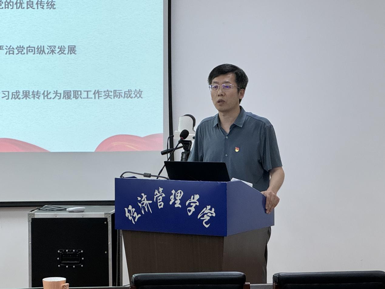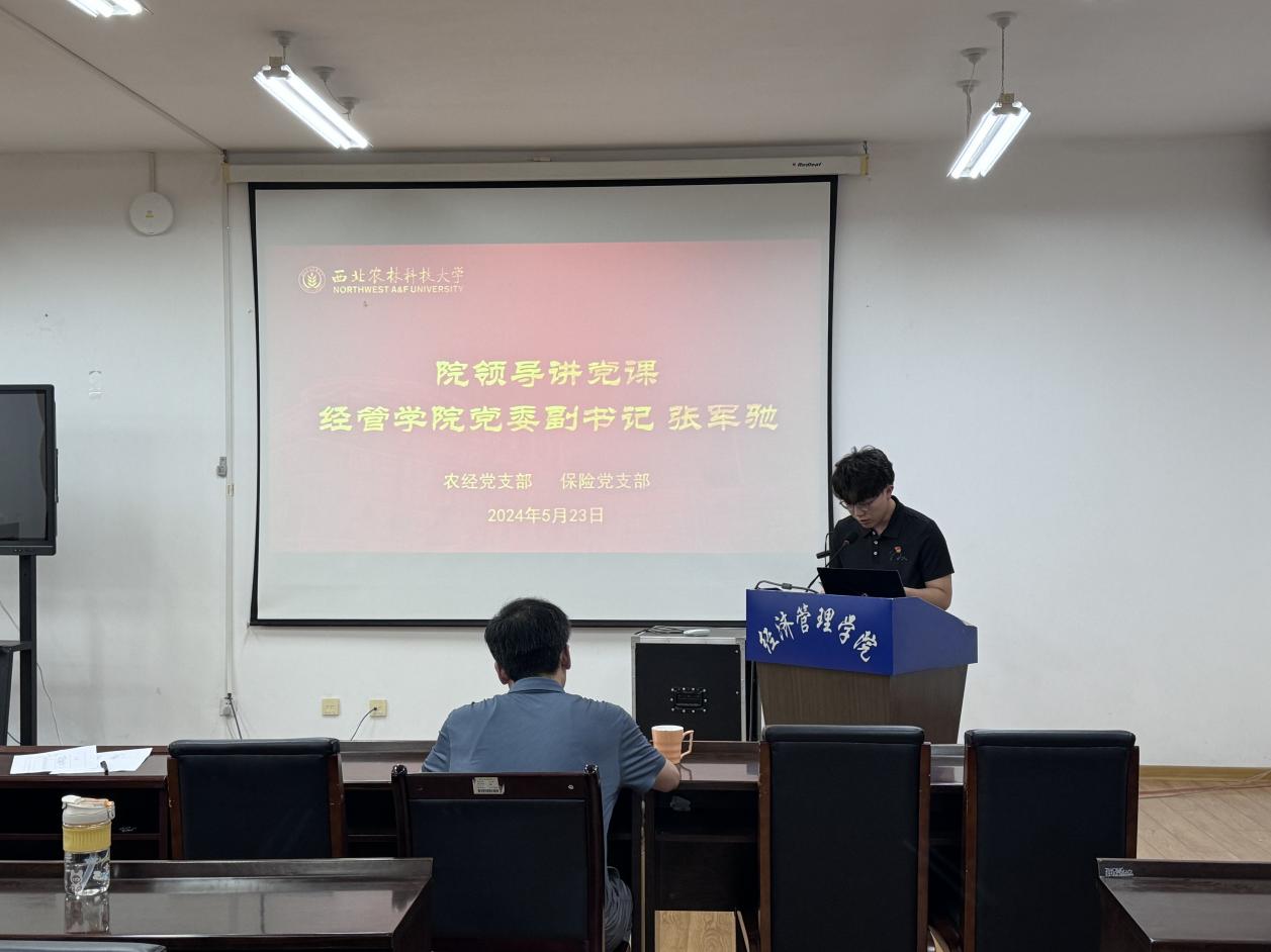 为深入贯彻落实习近平总书记关于党纪学习教育的重要讲话和重要指示批示精神,持续推动党纪学习教育走深走实,营造“学纪、知纪、明纪、守纪”的浓厚氛围,教育广大学生党员提升党性修养、增强纪律意识、践行服务宗旨、强化责任担当。5月23日,农经党支部联合保险党支部于C401开展党委委员讲党课活动,会议由农经党支部书记李冰主持,邀请学院党委副书记张军驰作题为《以严的基调全面加强纪律建设》的党课。