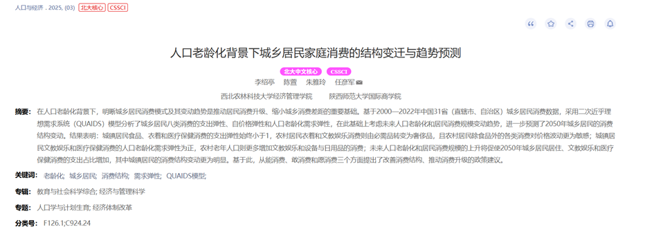 李绍亭, 陈萱, 朱雅玲, 任彦军*, 2025. 人口老龄化背景下城乡居民家庭消费的结构变迁与趋势预测. 人口与经济, (3), 56-70.