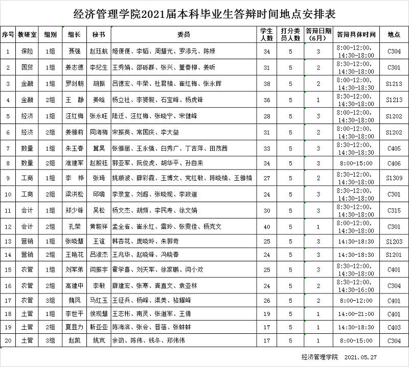 2021届本科生毕业答辩工作定于2021年6月1-3号进行,现将各答辩组的答辩时间、地点安排予以公布,请各位答辩组委员、秘书和毕业生认真严格执行。