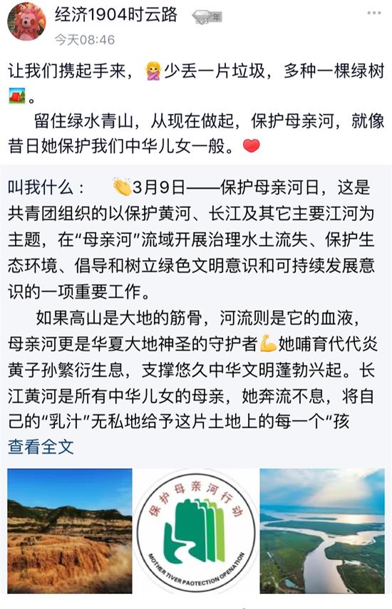经济1904班时云路在感想中写道:“让我们携起手来,少丢一片垃圾,多种一颗绿树。留住绿树青山,从现在点滴做起;保护母亲河,就像昔日她保护我们中华儿女一般。”