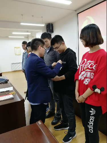 会上,张蚌蚌首先为支部全体党员同志佩戴党徽,并引导学生党员不忘初心,牢记使命,时刻铭记党员身份,践行党的宗旨,主动发挥模范作用,树立党员良好形象。