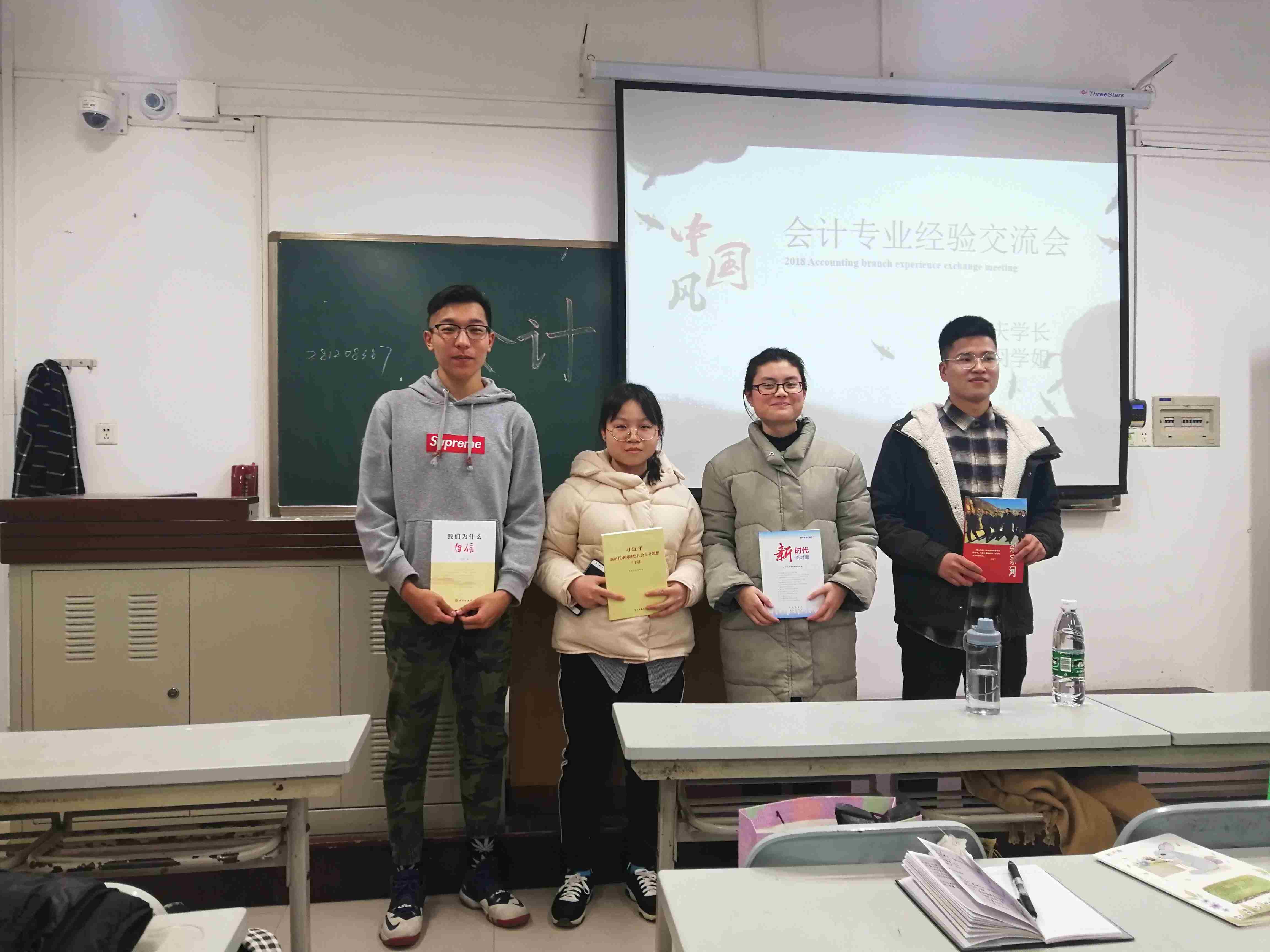 在交流提问的环节,有的同学问到了平时英语学习的学习方法,有的同学比较关注就业方面的问题,还有同学对保研考研由很大的兴趣。学长学姐都为我们做了详细的解答。他们也表达了对我们所有同学最衷心的祝愿,同时,罗根庆学长赠与三个团支部《我们为什么自信》、《梁家河》、《习近平新时代中国特色社会主义思想》与党的理论学习相关的书籍,我们十分感谢学长学姐能够与我们进行分享交流,也祝福学长学姐前程似锦。