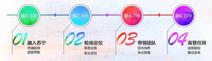 管理培训生采取特殊渠道、定向培养的方式,整合企业优秀培训资源,快速培养,通过融入苏宁,轮岗定位,团队带领,最终培养成集团的高层管理骨干。培养形式包括高管一对一带教,专业培训,海外考察等。